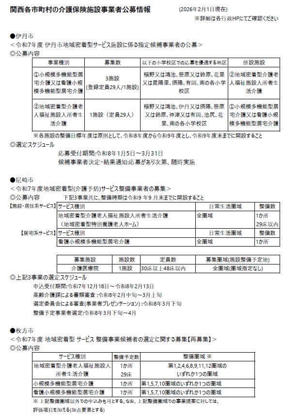 2026.2.1 関西各市町村の介護保険施設事業者公募情報